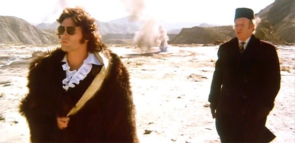 Robert Fuest came to the movie with reasonable credentials, having directed several episodes of The Avengers and also the pretty impressive 1970s version of Wuthering Heights with Timothy Dalton as Heathcliffe. He was also responsible for the black comedy horror movies The Abominable Dr Phibes (1971) and Dr Phibes Rises Again (1972). His take on Moorcock’s hero was very much in the tradition of British TV spy series like The Avengers or Jason King in which a staggeringly wealthy dandy travels the world in frilly white shirts seducing beautiful women and solving vaguely surreal mysteries. Halfway through shooting, not having a clue what was going on, the actors approached Moorcock for advice and he told them that the novel was intended to be a comedy, at which point they started playing for laughs. The result is a peculiar mix of earnest semi-Bond set pieces with long periods of witty repartee, mainly between Miss Brunner and Jerry Cornelius. It kind of works, but there are too many other factors dragging the movie down for it to be in any way successful.