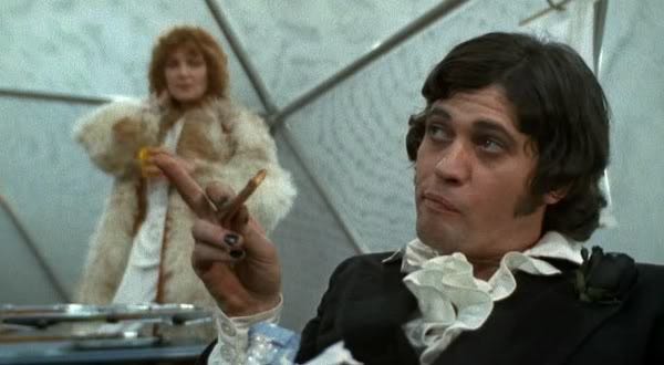 The second issue is a combination of flat direction and uncertain tone. Michael Moorcock, in an interview for the BFI in 2010, pointed out that Fuest’s insistence on endless reaction shots meant that virtually every dramatic beat in the movie was deflated by either a reverse take of a nodding head or an actor saying ‘Oh really?’. In his opinion The Final Programme could have been edited into a better paced film, but it would only have been five minutes long. The uneven tone is perhaps the inevitable result of the on-set confusion mentioned above. At times it’s incredibly frustrating because there are some very striking set pieces and images. The very beginning, for example, shows enigmatic figures striding over an icy wasteland in Lapland on their way to make a funeral pyre. It’s an evocative image, right up to the point when the music kicks in – an oompah oompah band playing something that sounds like the theme tune to a crap 60s TV sit-com, which utterly deflates the atmosphere (Hawkwind were originally in line to do the sound track. This was their Space Ritual period and to be honest it’s hard to think how their free-form space rock would have been any better).