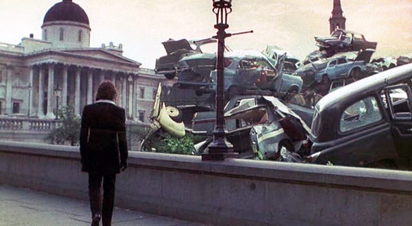 The first problem is clearly one of budget. The movie was made on a shoe string – even to the point where Robert Fuest’s own flat in London was used as Jerry Cornelius’s pad. The film is supposedly set during or just after World War Three when most of Europe has been nuked into oblivion, but apart from occasional throw-away references the only attempt to give it a post-apocalyptic feel is the iconic shot of Trafalgar Square filled with wrecked cars. The rest of the time all the external locations look like England (or Turkey) on a sleepy afternoon, with the cameras obviously pointed away from the locals going about their business, so we get a lot of low-angle skyline shots which just serve to empty the screenplay of any real context.